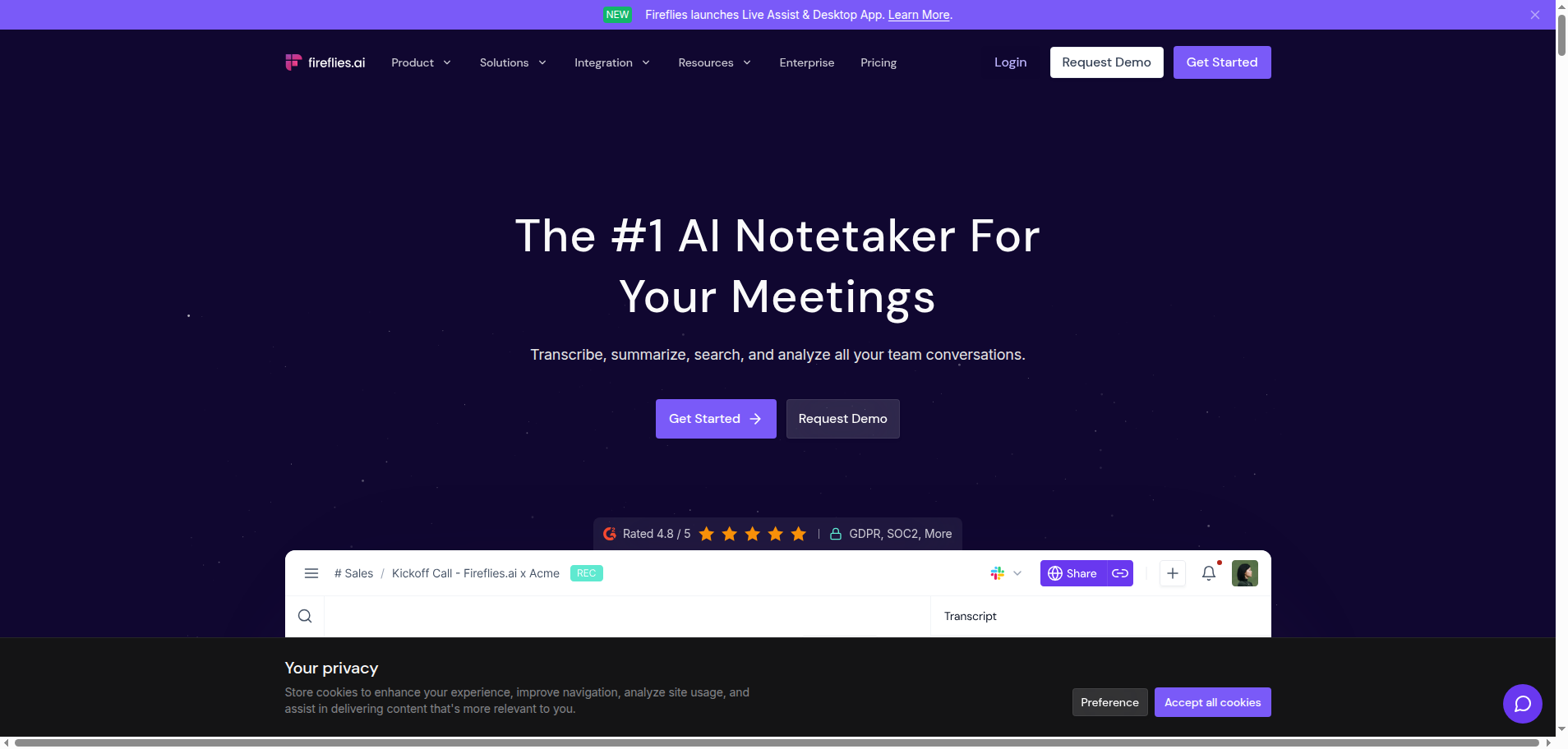Fireflies.ai records and transcribes meetings while providing sentiment analysis, speaking metrics, and CRM integration. Its AskFred AI chatbot allows querying past meetings using natural language.