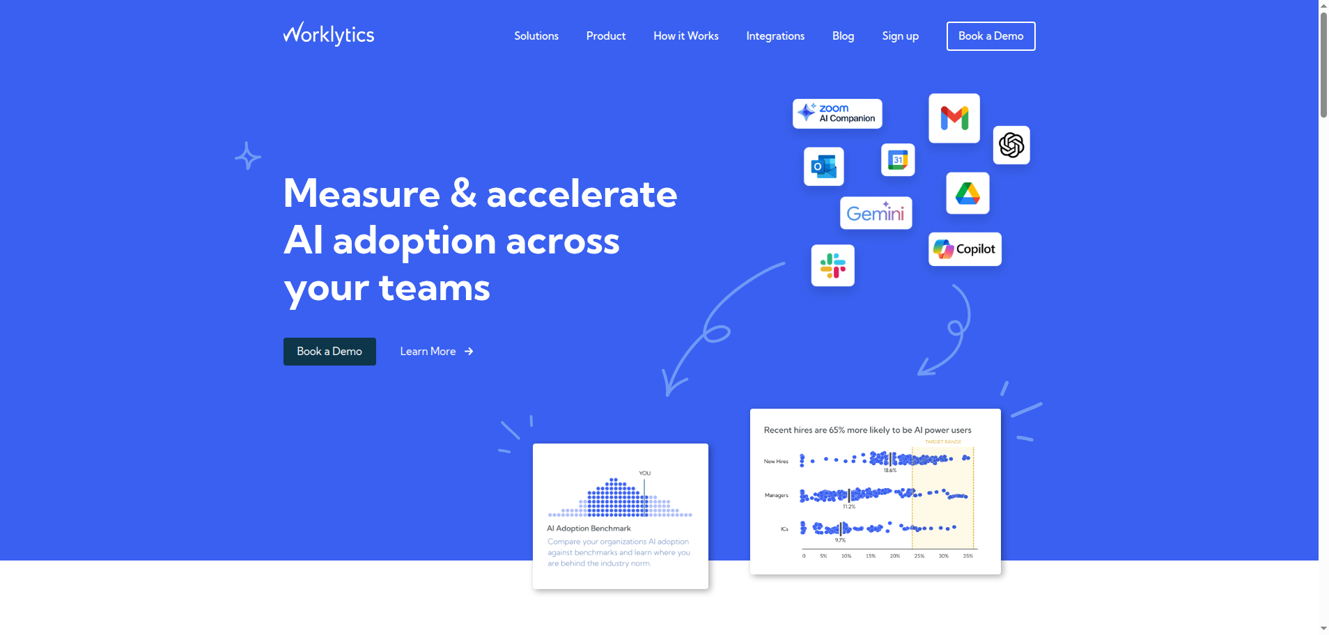 Worklytics is a people analytics platform delivering organization-wide visibility through 400+ metrics and privacy-preserving analytics. It connects to Google Workspace, Slack, Zoom, and Jira to analyze collaboration patterns and meeting effectiveness.